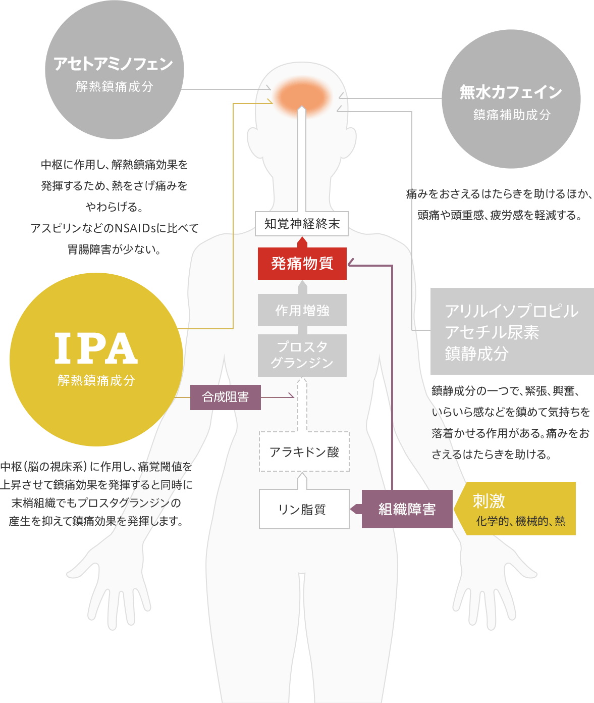 中枢に作用する解熱鎮痛成分イソプロピルアンチピリン(IPA)とアセトアミノフェンのはたらきで痛覚閾値を上昇。つらい痛みにもすぐれた鎮痛効果を発揮します。