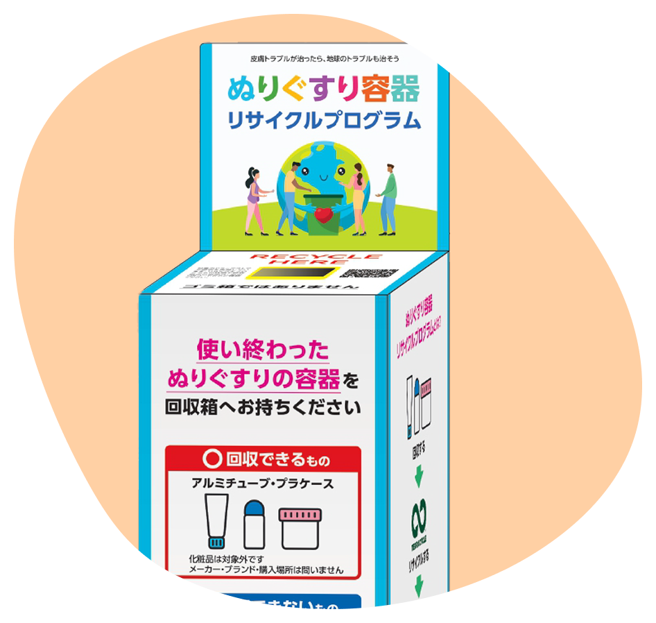 その容器は、使い終わると多くの場合、普通のごみとして捨てられています。しかし、その積み重ねは環境に大きな負担となります。日本国内で回収されるプラスチック製容器包装は、年間約76万トン※。その中には、私たちが日常的に使うぬりぐすりの容器も含まれています。一つひとつは小さな容器でも、集まれば決して無視できない量になるのです。そんな課題を少しでも解決するために、「ぬりぐすり容器リサイクルプログラム」を立ち上げました。使い終わったぬりぐすりの容器を回収し、資源として再利用することで、循環型社会の実現に貢献します。参加方法はとても簡単。使用済みのぬりぐすり容器を専用の回収BOXに入れるだけ。あなたの小さなアクションが、地球の未来を守る力になります。