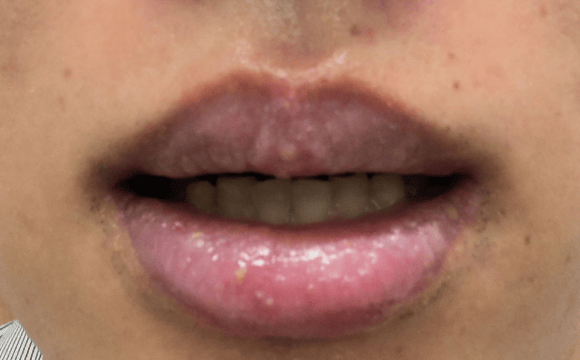 唇全体が乾燥してカサカサになり、皮がむけたり出血したりすることがあります。赤みや腫れ、かゆみ、ヒリヒリ感が出ることもあり、見た目にも目立ちやすいのが特徴です。重症化すると唇がただれたり小さな水ぶくれができたりすることもあり、食事や会話に支障が出ることも少なくありません。