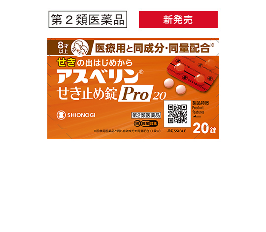 アスベリン® せき止め錠Pro20 は、チペピジンヒベンズ酸塩がせき中枢に直接作用し、せきをしずめるとともに、たんを出しやすくするせき止め薬です。