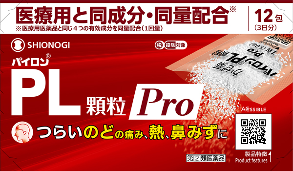 パイロンPL顆粒Proは、解熱鎮痛成分であるサリチルアミドとアセトアミノフェン、抗ヒスタミン成分であるプロメタジンメチレンジサリチル酸塩、痛みをおさえるはたらきを助ける無水カフェインの4つの有効成分の作用により、「のどの痛み」「発熱」「鼻みず」などのかぜの諸症状にすぐれた効果を発揮する非ピリン系のかぜ薬です。